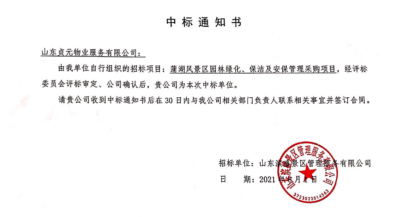 蒲湖風景區園林綠化、保潔及安保項目中標通知