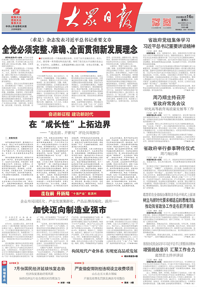 7月4日起,大眾日報及客戶端等全媒體平臺推出“走在前 開新局”大型主題報道,記者深入16市基層一線調研采訪,集中展現各地貫徹落實習近平總書記對山東工作的重要指示要求,錨定“走在前、開新局”,推進“三個十大”行動的創新舉措、進展成效,生動講述各地砥礪奮進、創新實干的鮮活事例,充分反映山東發展的新變化新氣象,以實際行動迎接黨的二十大勝利召開。今天刊發第三十八組報道:“十強產業”看濱州。