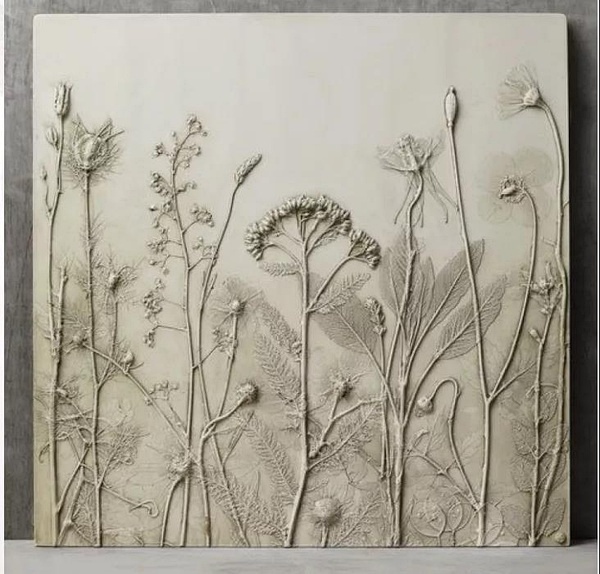 把選取好的植物放到陶泥上搟平,然后取出植物,倒入石膏漿,待半小時冷卻后進行脫模,這樣一個潔白的石膏浮雕就展現在我們眼前了。如果覺得顏色單一,還可以用顏料包涂色加以修飾。
