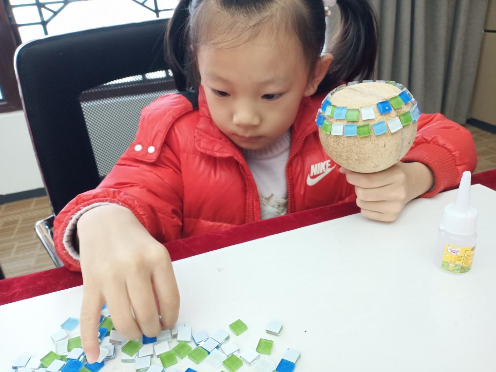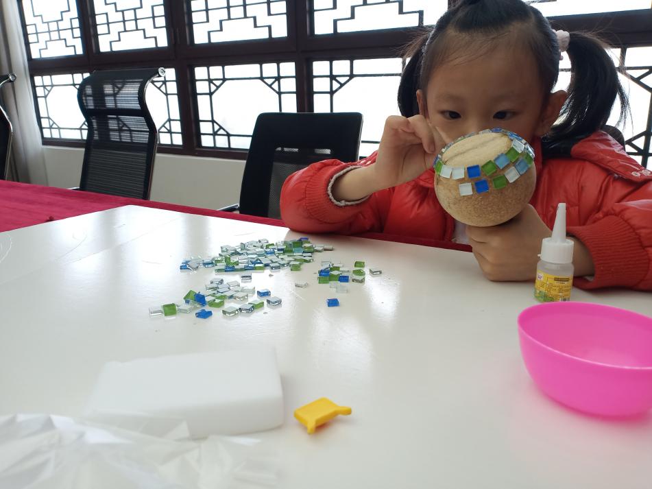 活動中,老師向?qū)W生們介紹了馬賽克花瓶的制作流程,讓大家將不同顏色的玻璃片倒在盤子里,并細心的一粒粒的粘貼在原色花瓶上,讓不起眼的瓶子成為一件嶄新的藝術(shù)品。