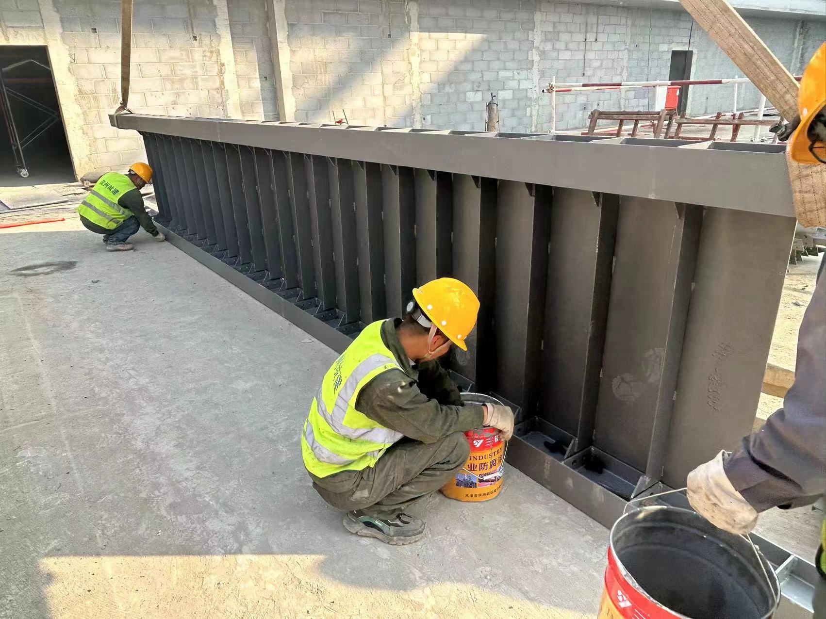 11月10日,濱州市全民健康文化中心項(xiàng)目一全民健身中心現(xiàn)場(chǎng)正在進(jìn)行游泳館鋼結(jié)構(gòu)屋頂馬道組裝及吊裝工作。本項(xiàng)目鋼結(jié)構(gòu)馬道主要由馬道梁、板、吊桿、扶手、欄桿等組成,布置在游泳館上空東、西、南三側(cè)成U字形,南北長(zhǎng)101.7m,東西長(zhǎng)47.6m共計(jì)251m。馬道寬1.2m,南北向主吊桿置于張弦梁下,東西向主吊桿置于次梁下。鋼結(jié)構(gòu)馬道施工計(jì)劃工期20天,11月5日開始,11月24日完成。