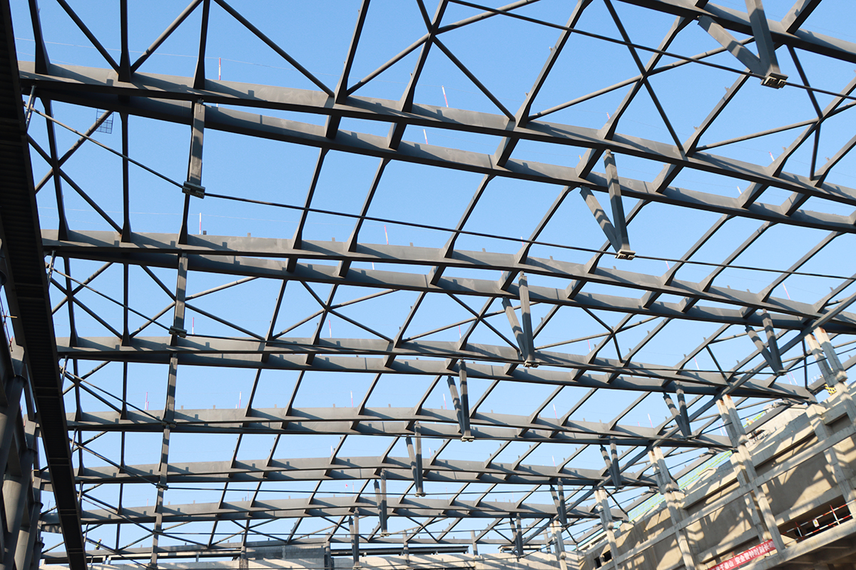 目前,濱州市全民健康文化中心項目-二標(biāo)段全民健身中心的游泳跳水館正在緊張施工中。該項目屋蓋為預(yù)應(yīng)力張弦梁結(jié)構(gòu),跨度57米的大廳沒有一根柱子支撐,在全市建筑領(lǐng)域內(nèi)跨度最大。該項目總用鋼量約720噸,單梁重達(dá)60噸,吊裝高度≥22m,高釩索張拉完成后經(jīng)測算拉力達(dá)到700t以上,施工前運用動態(tài)仿真模擬技術(shù),預(yù)先模擬吊裝全過程,以及施工過程中運用無人機輔助監(jiān)督操作等,確保結(jié)構(gòu)安全及施工安全。此為本項目工程施工中技術(shù)難度最大,安全施工要求最高的施工工藝。