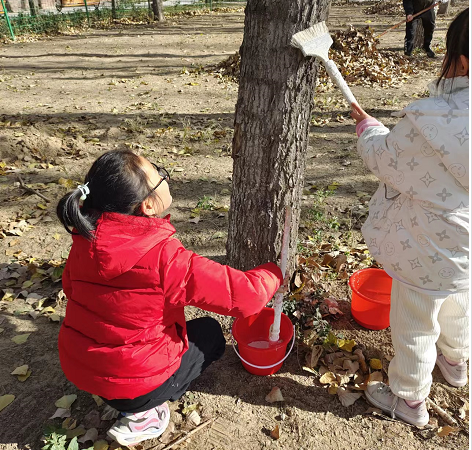 參觀結束后,學生們來到中心廣場,開始了“穿冬衣”活動。老師給大家講述冬衣的作用,冬衣怎么做,大家齊上陣,給大樹穿上過冬的衣服。學生們為小樹穿上的“冬衣”防蟲防凍,成就感滿滿。