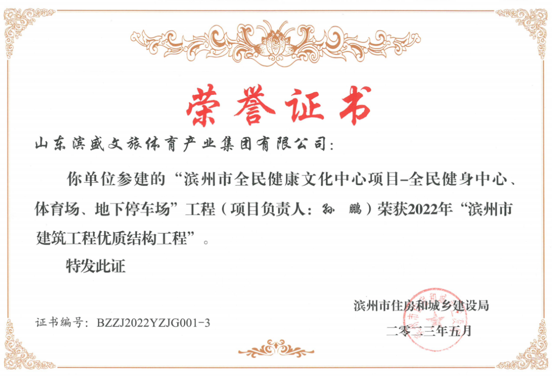 近日,2022年“濱州市建筑工程優質結構工程”名單公布,山東濱盛文旅體育產業集團有限公司建設的“濱州市全民健康文化中心項目-全民健身中心、體育場、地下停車場”工程位列其中。