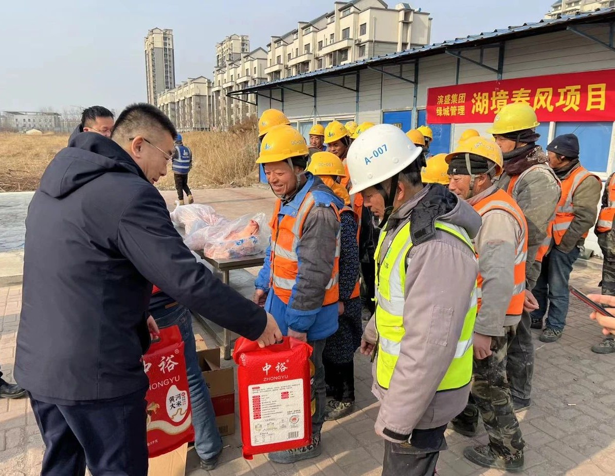 在項目現(xiàn)場,張治國一行親切詢問了工人的工作、生活和家庭情況,對廣大工人在春節(jié)來臨之際仍堅守工作崗位表示感謝,并為項目工人發(fā)放了肉、米、油等年貨禮包和新春祝福,祝愿大家在新的一年身體健康、工作順利、闔家幸福。