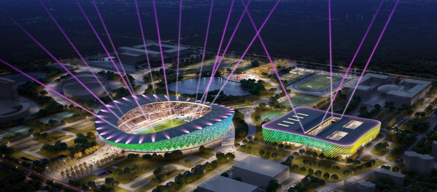 該項目設計上區別于傳統LED屏廣告模式,結合體育場建筑的外觀設計結構,在照明設計中突出建筑的結構美學特征的同時,重點突出投影視頻效果。設備上,采取了LED全彩點光源+高清戶外專用投影機與光束電腦燈相搭配的方案,為保證大屏效果,還添加了LED全彩投光燈+洗墻燈進行效果補足;燈光效果上,作為一個城市的重要窗口和城市地標來打造,亮化級別為必須亮化級;基本采取智能化控制,可根據不同的需求隨意的調整燈光效果能夠滿足各類商業廣告投放需求;功能上,建筑所有立面點光源可以形成整體聯動,并呈現抽象畫圖形,讓建筑燈光有了不同的視覺感官。