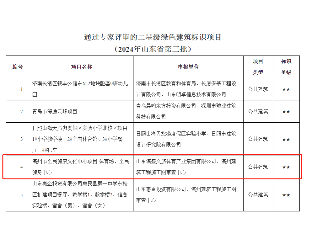 近日,根據山東省住房和建設廳發布山東省2024年第三批二星級綠色建筑標識項目公示,由山東濱盛文旅體育產業集團有限公司投資建設的濱州市全民健康文化中心項目榮獲山東省2024年第三批二星級綠色建筑標識項目。