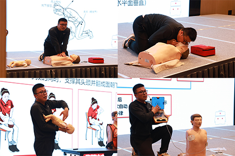 培訓中,急救師將理論與實踐相結合,將數字化與實地式教學相統一,詳細介紹了心肺復蘇、自動體外除顫儀以及海姆立克急救法的使用規范和注意事項,并通過演示操作、一對一考核等形式引導學員“沉浸式”體驗急救過程,促進學員對相關急救知識與技能的充分理解和掌握。